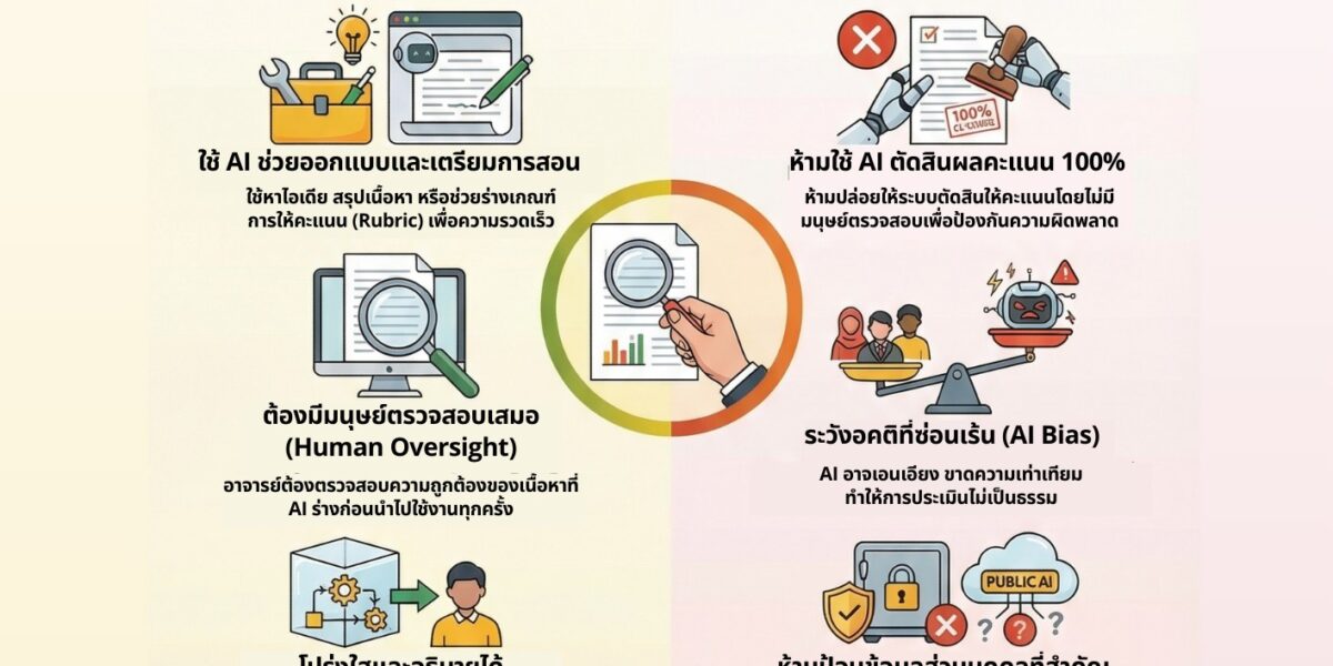 DON’T: ห้ามปล่อยให้ AI ตรวจข้อสอบหรือตัดเกรดเอง 100% โดยไม่มีเกณฑ์ที่อธิบายได้ เพราะ AI อาจมีอคติ (Bias) แฝงอยู่!